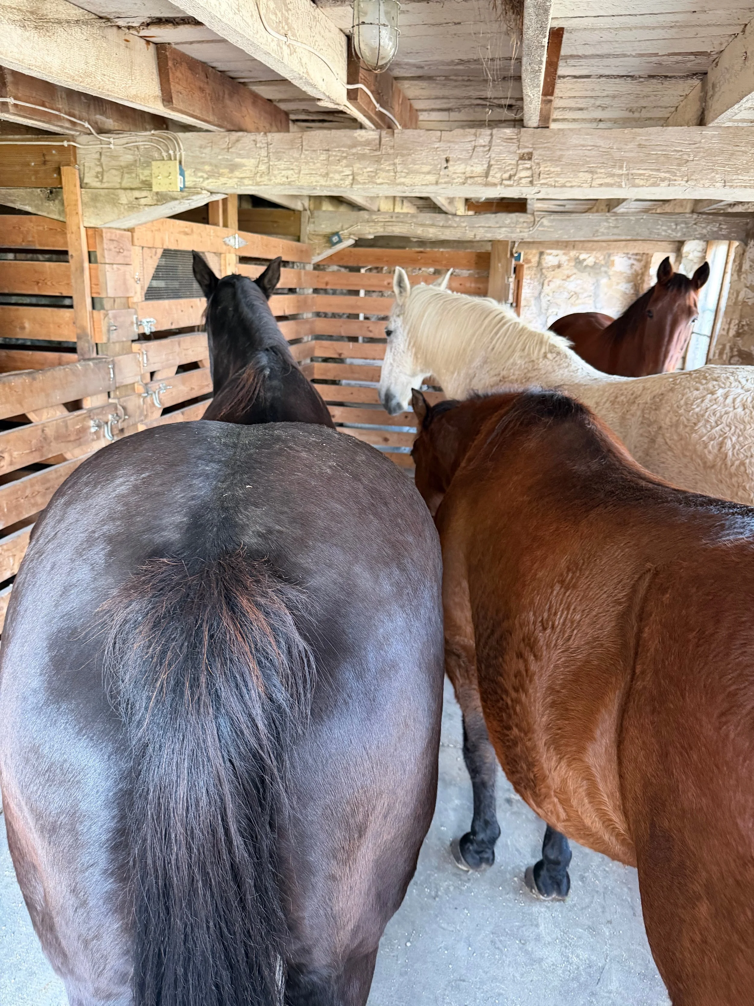 Today, these wonderful horses enjoy being groomed and walked and are provided with plenty of loving care. They spend their days on open pasture and return to their stalls twice a day for special feeding. Because of their work history, and on the advice of our veterinarian and farrier, none of the horses are ridden.
